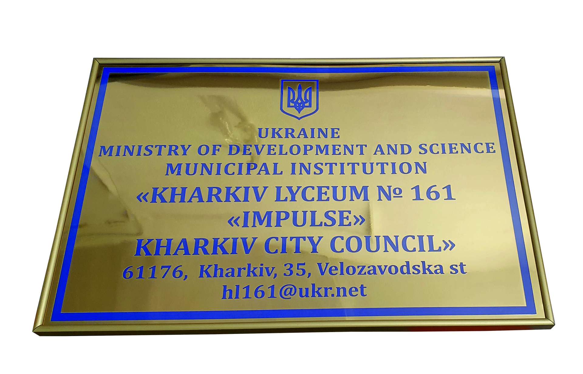 Вывеска из золотого пластика с защитным прозрачным стеклом в защитной золотистой алюминиевой рамке в Запорожье. Изготавливаем любой размер вывески с индивидуальным просчетом.